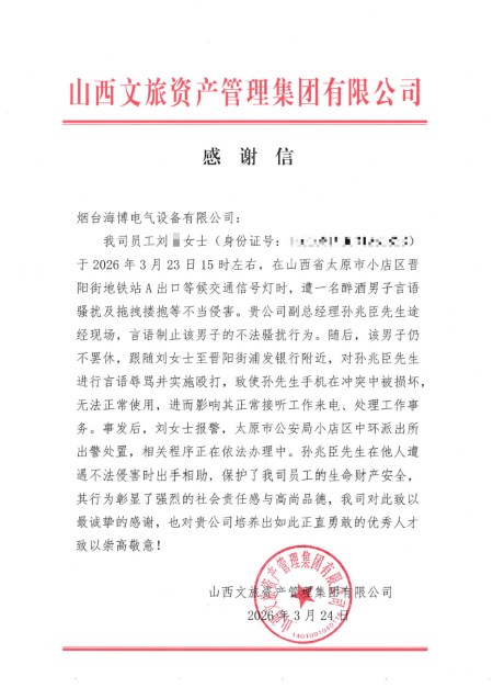事后,山西文旅资产管理集团有限公司专程发来感谢信,对孙兆臣的义举致以崇高敬意,并高度赞扬烟台海博电气设备有限公司培养出了如此正直勇敢的优秀人才。