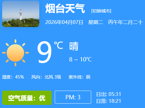 常规预报: 烟台市海洋环境监测预报中心发布24小时海洋预报(4月7日0时-4月8日0时) 东部海域(开发区至牟平区)将有0.7米的轻浪,风浪向 北 ;平均水温:7.8-8.7℃; 蓬长海域(蓬莱区)将有0.6到0.7米的轻浪,风浪向 北 ;平均水温:5.7-9.1℃; 西部海域(莱州市至龙口市)将有0.6米的轻浪,风浪向 北 ;平均水温:8.9-10.7℃; 南部海域(海阳市至莱阳市)将有0.6米的轻浪,风浪向 北 ;平均水温:11.1℃;