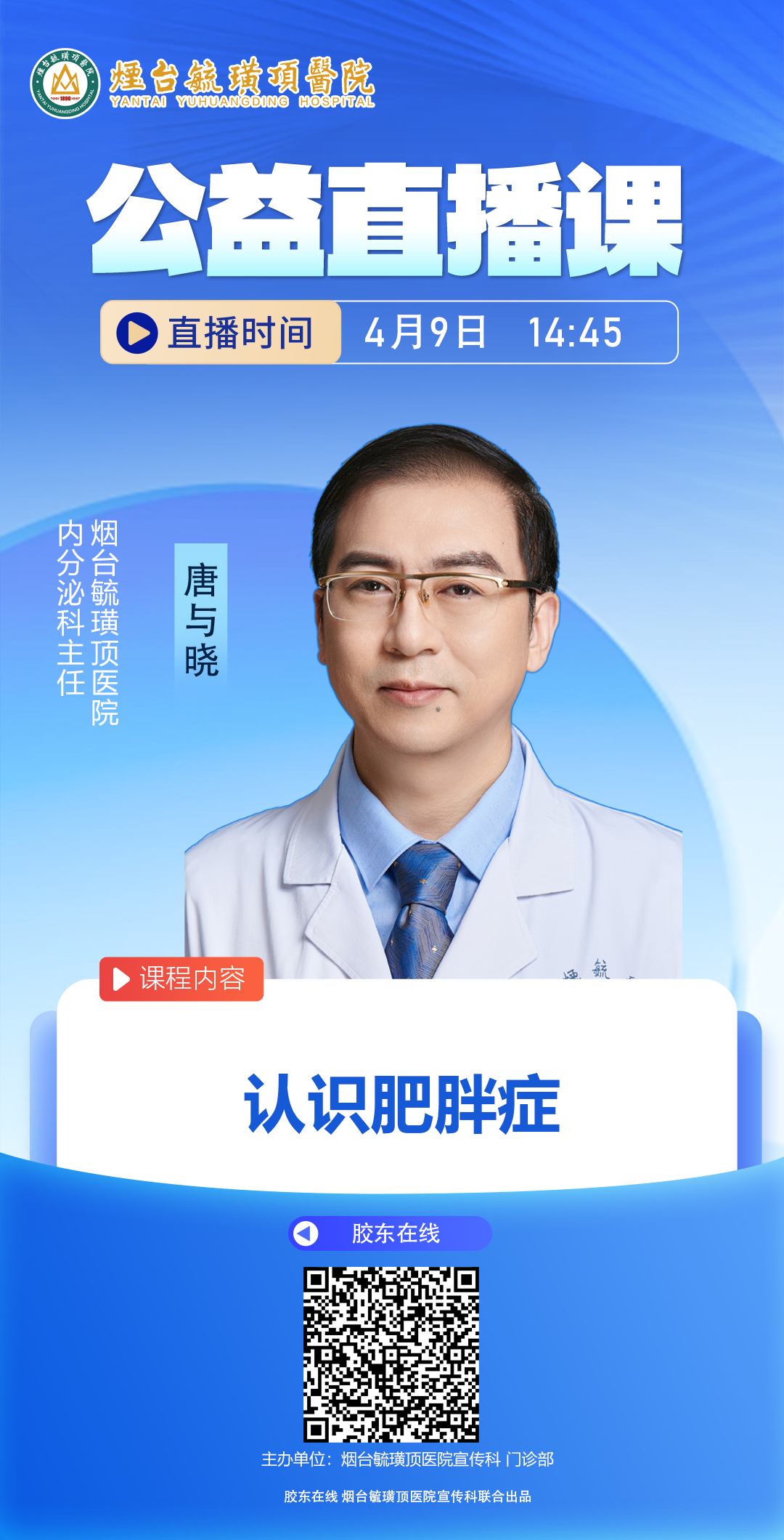 很多人尝试过节食、暴走、吃减重产品,却屡屡陷入 “减重 - 反弹 - 更胖” 的恶性循环,殊不知肥胖的成因远比想象中复杂,基因、神经内分泌、心理压力、环境因素等多重原因相互作用,盲目减重不仅效果甚微,还可能损伤身体。为了帮大家走出减重认知误区,科学认识肥胖症,掌握专业、安全的体重管理方法,烟台毓璜顶医院门诊健康讲堂系列之九——“认识肥胖症”即将开讲!我们特邀烟台毓璜顶医院内分泌科主任唐与晓开启专场科普直播,全方位拆解肥胖真相,手把手教你做好个性化体重管理!