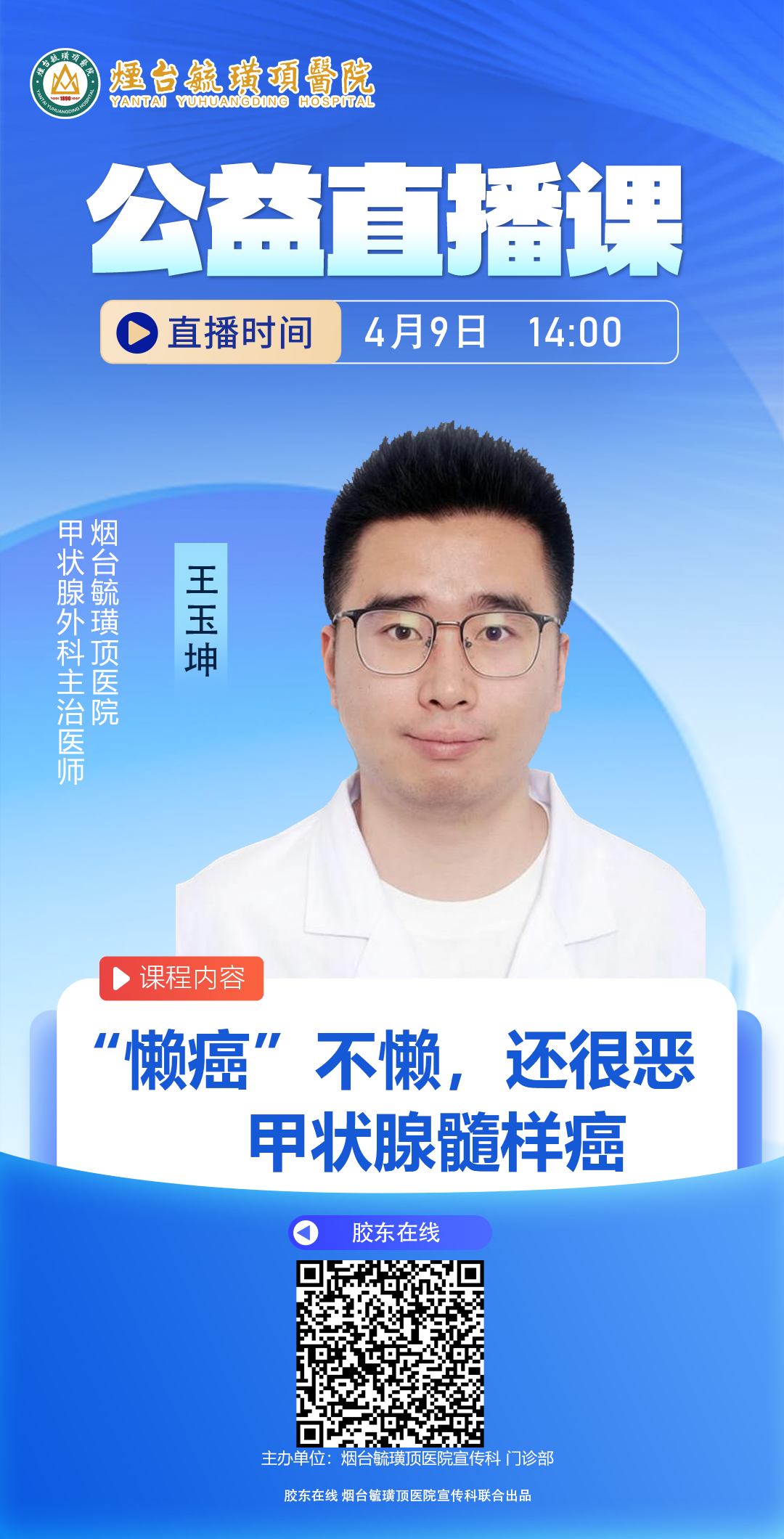 为了让大家认清甲状腺髓样癌的真面目,避开认知误区,掌握科学的防治、筛查与随访知识,特邀烟台毓璜顶医院甲状腺外科主治医师王玉坤开启科普直播,用专业的医学知识为大家的甲状腺健康保驾护航!