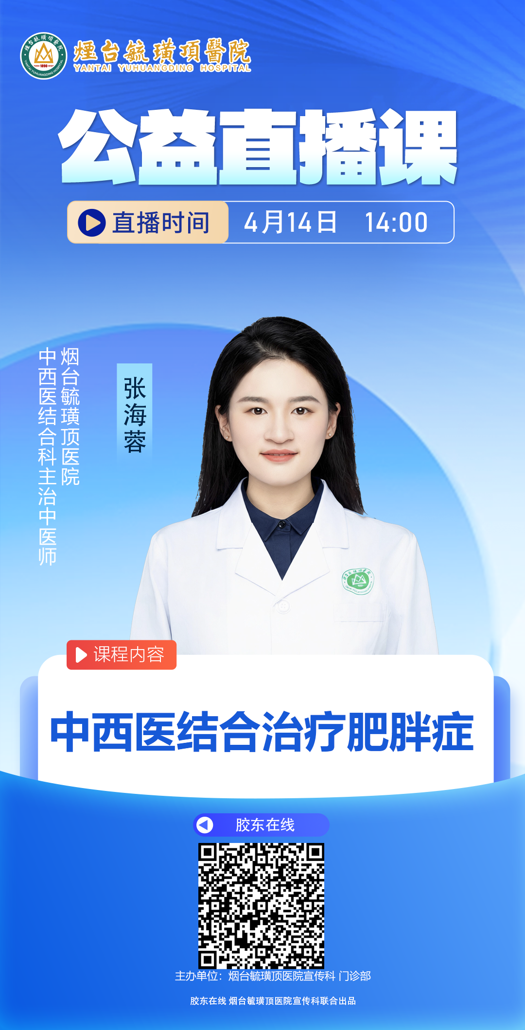 为帮助大家走出减肥误区,掌握安全、有效、易坚持的科学减重方法,烟台毓璜顶医院门诊健康讲堂系列之十——“中西医结合治疗肥胖症”即将开讲!我们特别邀请烟台毓璜顶医院中西医结合科主治中医师张海蓉,带来专场科普直播,围绕肥胖的成因、危害、诊断标准及个性化调理方案,进行全面、通俗、实用的讲解。