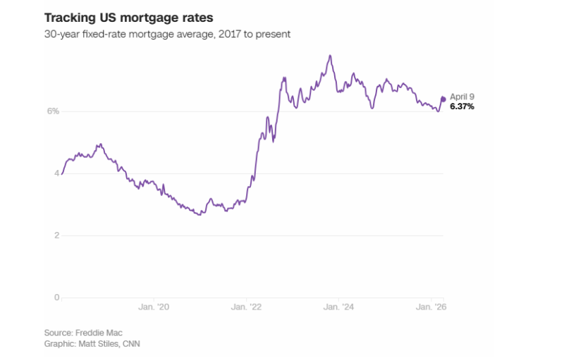 根据美国住房金融机构房地美(Freddie Mac)的数据,战争开始以来,美国抵押贷款利率连续五周攀升,本周才有所回落,30 年期固定抵押贷款的平均利率小幅下降至 6.37%。