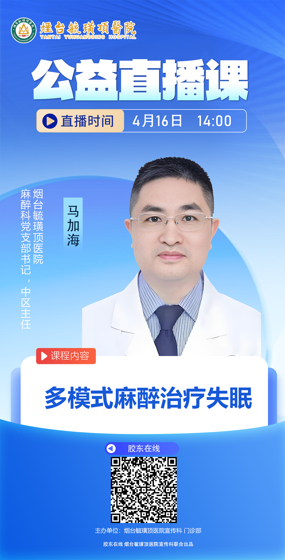 很多人误以为失眠只能靠药物硬扛,其实在专业医学体系中,早已拥有更安全、更有效、更个体化的治疗方案。烟台毓璜顶医院门诊健康讲堂系列之十二——“多模式麻醉治疗失眠”即将开讲!为帮助广大失眠人群走出误区、科学安睡,我们特邀烟台毓璜顶医院麻醉科马加海主任医师,带来《多模式麻醉治疗失眠》主题科普直播,系统认识失眠、科学干预失眠。