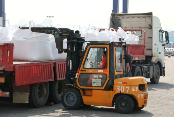 据悉,此次进口集装箱化肥作业采用“集装箱拆箱+吨包灌装”一体化模式,作业人员将化肥集装箱拆箱后,通过专业灌包设备直接完成吨袋封装,实现全程高效流转。相较于传统小袋分装,吨包作业具有大容量、易装卸等优势,配合叉车等专用作业设备,可实现单元化转运、存储,大幅提升作业效率。“从拆箱到灌装再到堆码,全流程衔接顺畅,单箱作业效率比传统模式提升超40%,既省时又省力。”仓储班组负责人孙悦海表示。