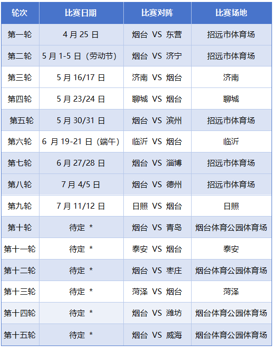 烟台队将坐镇招远市体育场、全新改造升级的烟台体育公园体育场两大主场,迎接全省劲旅的挑战。