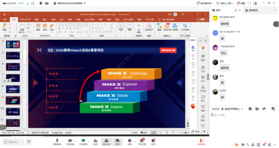 本次培训围绕MakeX挑战赛、TAI智能车实践赛、智驾竞速无人车挑战赛、AI创无界及Super AI五大竞赛项目,采用腾讯会议线上直播形式分两天进行。主讲老师对每个项目的场地规格、任务要求、评分标准、违规判定等核心规则进行了逐条深度解读,并结合实际案例,系统剖析了机械结构设计、传感器应用、程序编写及团队协作策略等技术难点。
