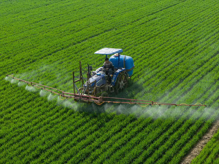 2026年3月25日,河南省三门峡市灵宝市西阎乡西古驿村农民在麦田进行“一喷三防”作业(无人机照片)。新华社发(杜杰 摄)