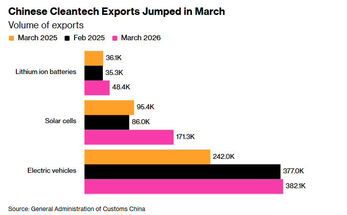 美国彭博社18日发表的文章指出,在全球能源供应因伊朗战争陷入混乱之际,中国3月份的清洁技术产品出口激增。