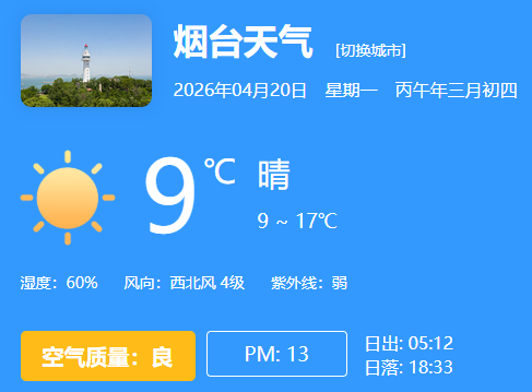 南部海域(海阳市至莱阳市)将有1.7米的中浪到0.7米的轻浪,风浪向西北;平均水温:13.9℃;