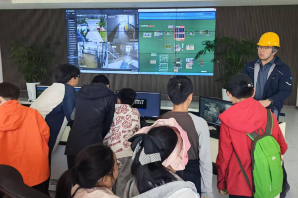 紧接着,大家走进中控室,实时监控大屏瞬间吸引了同学们的目光。工程师介绍,这里是污水处理厂的 “智慧大脑”,可实时监测各项工艺运行数据、设备状态与出水水质,确保每一滴水都达标处理。同时,工程师还介绍了厂区的处理规模:烟台市莱山区、高新区和牟平区西部的污水处理任务,设计日处理量达13万吨,目前基本满负荷运行,南侧三期全地下工程正在建设,未来将进一步提升处理能力。