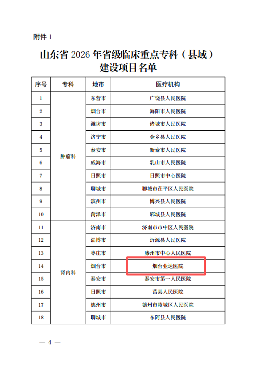 山东省省级临床重点专科(县域)建设项目是省卫健委推动优质医疗资源下沉、提升县域医疗服务能力的重要举措。省卫健委要求,各建设单位要综合考量地域等因素,加强重点专科建设,合理规划布局,增强服务能力,提升服务水平,切实发挥重点专科在区域内的引领和辐射带动作用。烟台业达医院肾内科的入选,正是对科室综合实力的充分肯定。