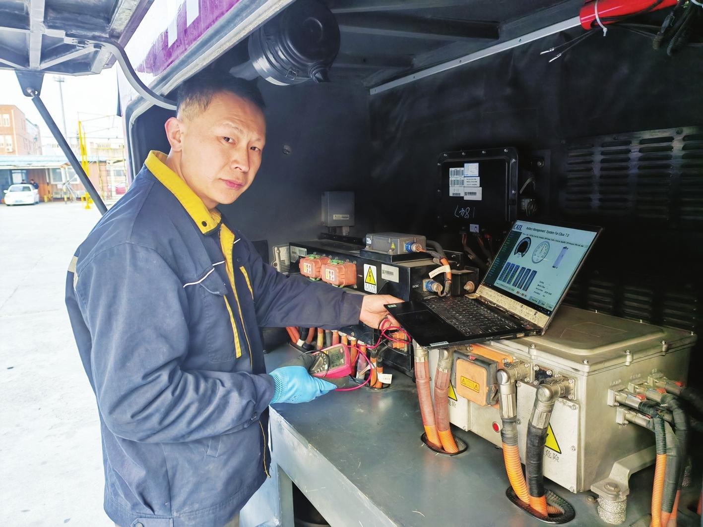 从业18年来,刘峰秀始终扎根公交维修一线,兜里常年揣着笔记本,随时记录故障案例、维修心得。地沟狭小闷热,他常常蜷缩其中数小时,只为摸清一处异响根源、攻克一个电路难题。面对公交车型从燃油向新能源的快速迭代,他不满足于既有经验,主动钻研前沿技术,从基础电路图入手,一步步攻克CAN网络总线诊断、车辆模块匹配等技术难关,练就了通过数据流快速定位故障的绝活,成为同事公认的“公交医生”。