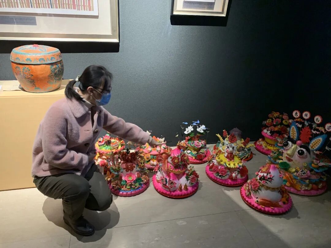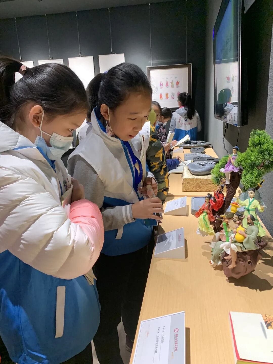 在讲解员李老师的带领下,小记者们兴致勃勃地参观了烟台市非遗文化馆。里面陈列的剪纸、面塑、草编、泥塑、绒绣、胶东花饽饽等名家非遗作品,让小记者们兴致盎然。大家仔细观察,用心记录。