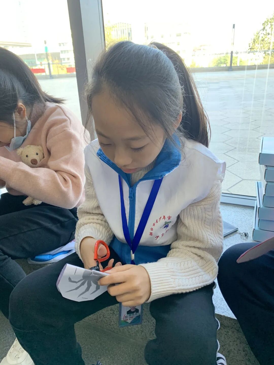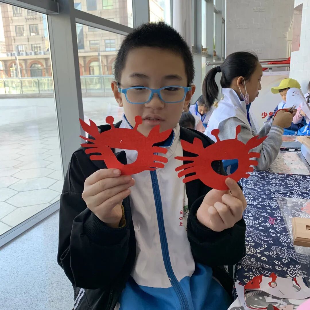 参观完非遗文化馆,小记者回到青少年宫非遗教室,体验烟台剪纸。在唐金枝老师的指导下,小记者们拿起剪刀,一点一点的开始剪起来。一会儿,有的小记者把螃蟹腿剪断了,有的把火箭头剪掉了,经过四十分钟的“奋战”,小记者们才完成了一副剪纸作品。“原来剪纸很不简单!”小记者们纷纷发出感慨。