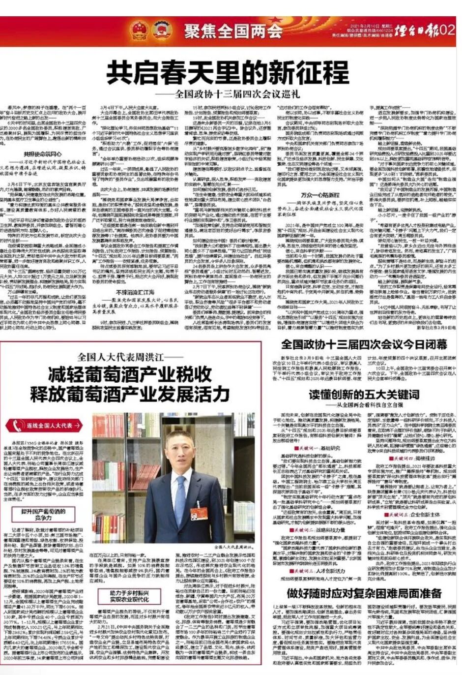 阳春三月,中国如期进入“两会时间”。代表委员们齐聚北京,积极履行职责、建言献策。作为中国葡萄酒行业为数不多的全国人大代表,张裕公司董事长周洪江向两会提交了取消葡萄酒消费税,振兴葡萄酒产业等建议。《人民日报》、新华社、中央电视台、山东电视台、央广网、《证券时报》、《中国证券报》、《第一财经日报》、《经济观察报》、《财经》、《烟台日报》、《葡萄酒商业观察》、《云酒头条》等媒体对周洪江董事长的建议进行了关注与报道。