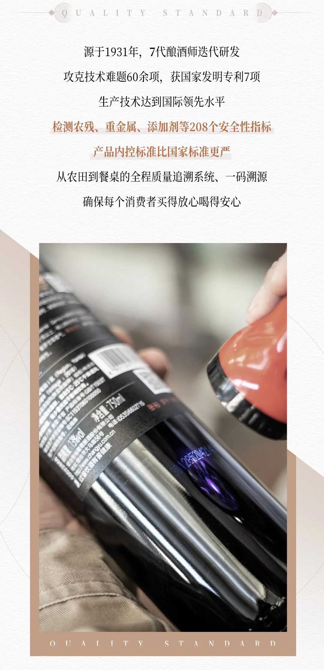 呈深宝石红色,伴有浓郁的黑樱桃、李子、树莓等黑色水果香气,果香与橡木桶陈年所带来的巧克力、烟熏、雪松、烟草等香气完美结合,单宁紧致且柔和,回味悠长,更加醇厚平衡,具有典型的品种陈年特性。