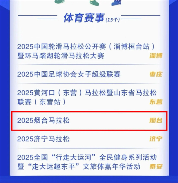 近日,山东省体育局发布了2025“好运山东”体育消费创新场景重点培育项目名单,涵盖体育赛事、体育融合、主题活动等方面。其中,烟台市的2025烟台马拉松、“活力之城·仙境烟台”体育嘉年华、黄渤海城市体育联盟(烟台)消费季三个项目成功入选。