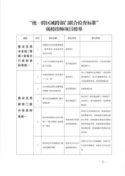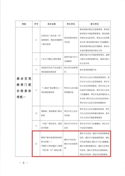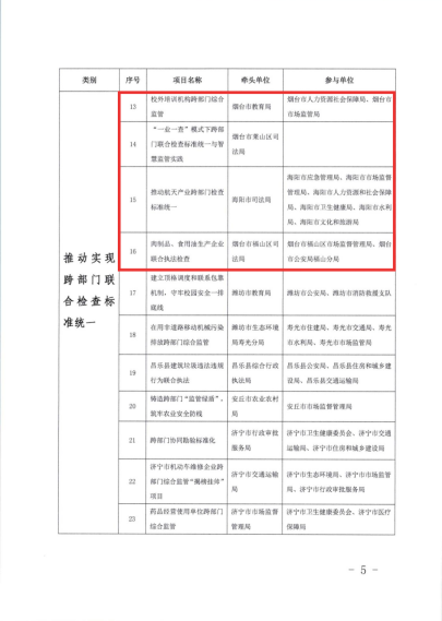胶东在线12月30日讯 近日,山东省司法厅印发《关于发布“统一跨区域跨部门联合检查标准”揭榜挂帅项目榜单的通知》,正式确定了“统一跨区域跨部门联合检查标准”揭榜挂帅项目榜单。其中,烟台市有五个项目成功入选,分别是市司法局与市应急管理牵头的跨部门联合检查的机制创新与实践、市教育局牵头的校外培训机构跨部门综合监管、莱山区司法局牵头的“一业一查”模式下跨部门联合检查标准统一与智慧监管实践、海阳市司法局牵头的推动航天产业跨部门检查标准统一、福山区司法局牵头的肉制品、食用油生产企业联合执法检查。