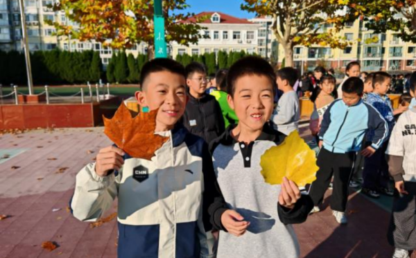 活动当日,阳光和煦,四年级的同学们在老师的带领下,兴致勃勃地走进熟悉的校园。他们的目光不再仅仅停留于教室与操场,而是专注地投向那一片片翩跹起舞、色彩斑斓的落叶。白杨叶灿黄如小扇,梧桐叶褐红似手掌,枫叶如火,松针铺地……孩子们小心翼翼地捡起这些大自然的信使,端详它们的形状、颜色和纹理,不时发出惊喜的赞叹。有同学轻轻捧起一把落叶说:“看,这是秋天写给我们的信!”他们将形态各异的落叶视为秋天的独特语言,通过它们解读季节变换的密码。