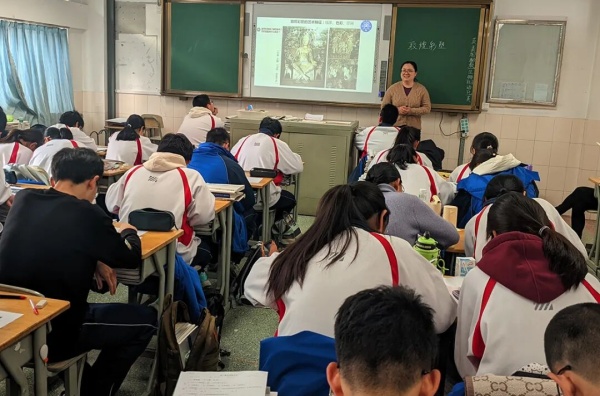 在莱阳一中,黄老师执教展示课《敦煌艺术》,以“文化溯源+技法实操”为脉络,通过数字影像还原敦煌壁画艺术场景,引导学生从色彩运用、构图逻辑中解读传统文化内涵,课堂上沉浸式的探究氛围与精准的专业指导,赢得在场师生高度认可。