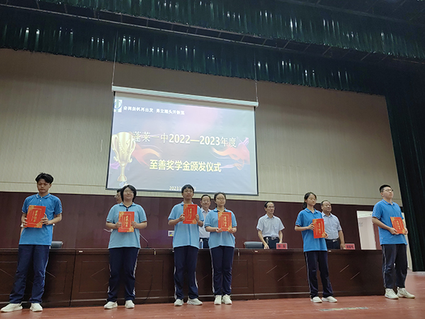 为树立至善榜样,奖励优秀学子,特举行蓬莱一中2022-2023年度奖学金颁发仪式。蓬莱一中副校长丁少莲宣读《关于发放2022-2023学年度奖学金的决定》,学校领导为获奖学生颁发“至善奖学金”。获奖学生代表2022级解蕙雨上台发言:感谢学校对优秀学生的肯定与激励,感恩老师的付出与奉献,并向高一新生们发出一齐奋斗的邀请——调动全部智慧,凝聚全部热情,乘着蓬莱一中这艘巍巍巨轮追风赶月,探求人类智慧的深遂与奥秘,感受真理的本质与自然,实现我们灿烂的梦想,铸就一中新的辉煌!