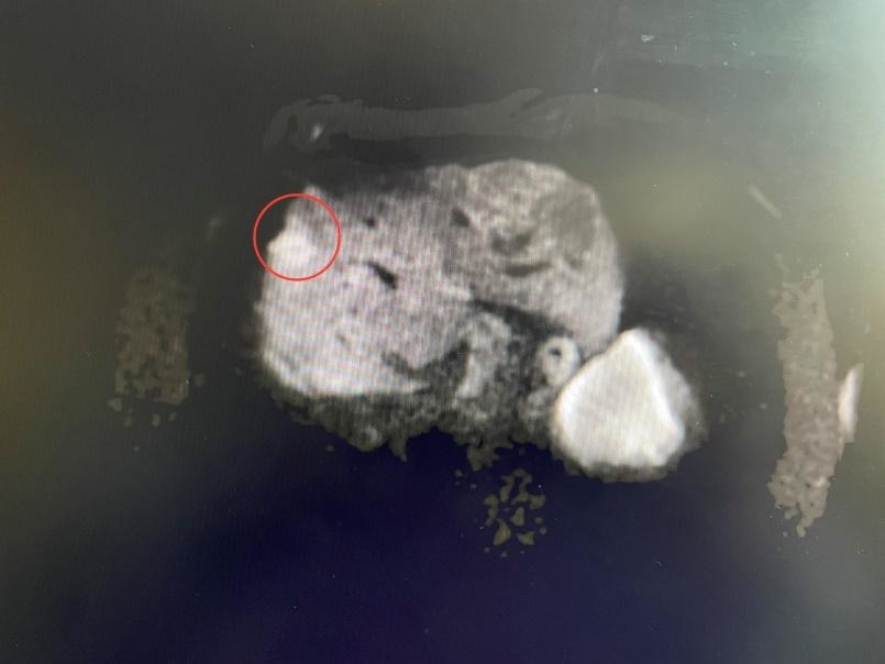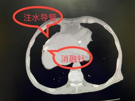 为破解这一难题,姜文进和团队决定启用“水隔离”技术。手术中,在CT实时引导下,姜雨田主治医师先将极细穿刺针精准刺入肿瘤与膈肌的微小间隙;考虑到肿瘤位置较高,常规注入生理盐水易流失,姜文进副主任医师创新采用“置管喷洒冰水”方案,在需保护的膈肌区域留置导管,持续喷洒冰水,形成一道“水循环护城河”;最终,消融针在隔离带保护下直达肿瘤内部释放能量,流动的冰水如同“内置冷却系统”,既实现肿瘤从内到外的彻底消融,又将膈肌温度控制在安全范围,全程无任何脏器损伤。