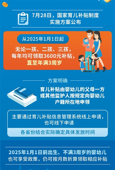 今年7月28日,国家育儿补贴制度实施方案公布,从2025年1月1日起,无论一孩、二孩、三孩,每年均可领取3600元补贴,直至年满3周岁。据悉,多地育儿补贴审核工作正在提速,预计从10月底到12月,第一批育儿补贴资金将迎来一拨集中发放。