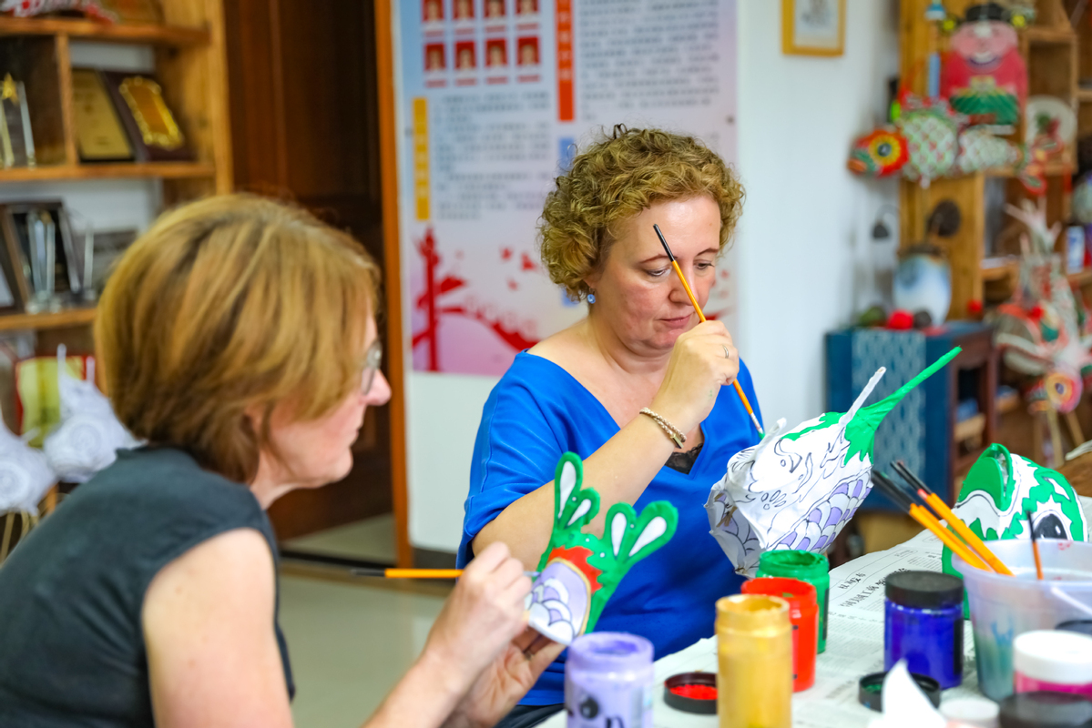 6月12日,外国游客在宏村非遗体验馆体验制作非遗鱼灯。(图片来源:新华社)