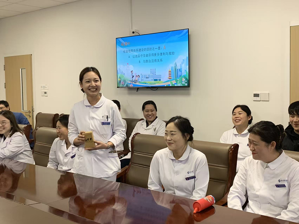 活动现场氛围庄重而热烈,各环节紧扣医疗行业特色,层层递进深化诚信认知。首个环节便直入主题,全体与会人员聚焦《山东省社会信用条例》中公共信用信息、失信行为认定、信用激励与惩戒等核心内容进行学习,同时主持人结合医疗场景解读条例细则:“病历书写的真实准确、病情告知的坦诚透明、患者隐私的严格保护,都是医疗诚信的具体体现。”让医务工作者清晰知晓“诚信”在诊疗全流程的具体要求,为后续践行诚信准则筑牢理论基础。