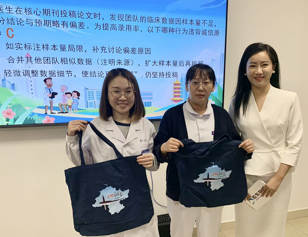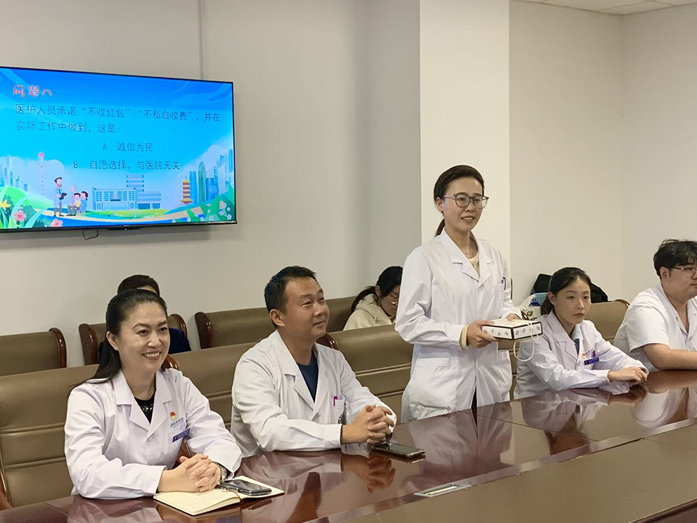 随后,诚信知识竞答环节瞬间点燃现场热烈氛围!“医院工作人员如实告知治疗方案、费用明细,属于哪类行为?”“保护患者隐私是医院的职业道德与诚信义务吗?”一道道贴合医疗工作实际的题目被先后抛出,现场在座医师迅速起身作答,其中骨科医生刘通反应敏捷,话音刚落便获得主持人肯定,他笑着说:“题目都是日常工作会遇到的,答题过程也是一次诚信自查,在互动中进一步明确医疗诚信的底线要求。”