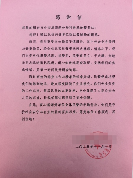 10月29日16时许,警务站接110指令称:辖区一男子不慎遗失办公用品,内有重要业务资料。接警后,民辅警立即排查寻找,并安抚报警人的情绪。经不懈努力,民辅警成功找回遗失物品,避免了企业损失。看着报警人脸上绽放的笑容,民辅警心中也感到无比充实。11月13日,该男子特地送来感谢信1封和写有“警民携手,共创平安”的锦旗1面。
