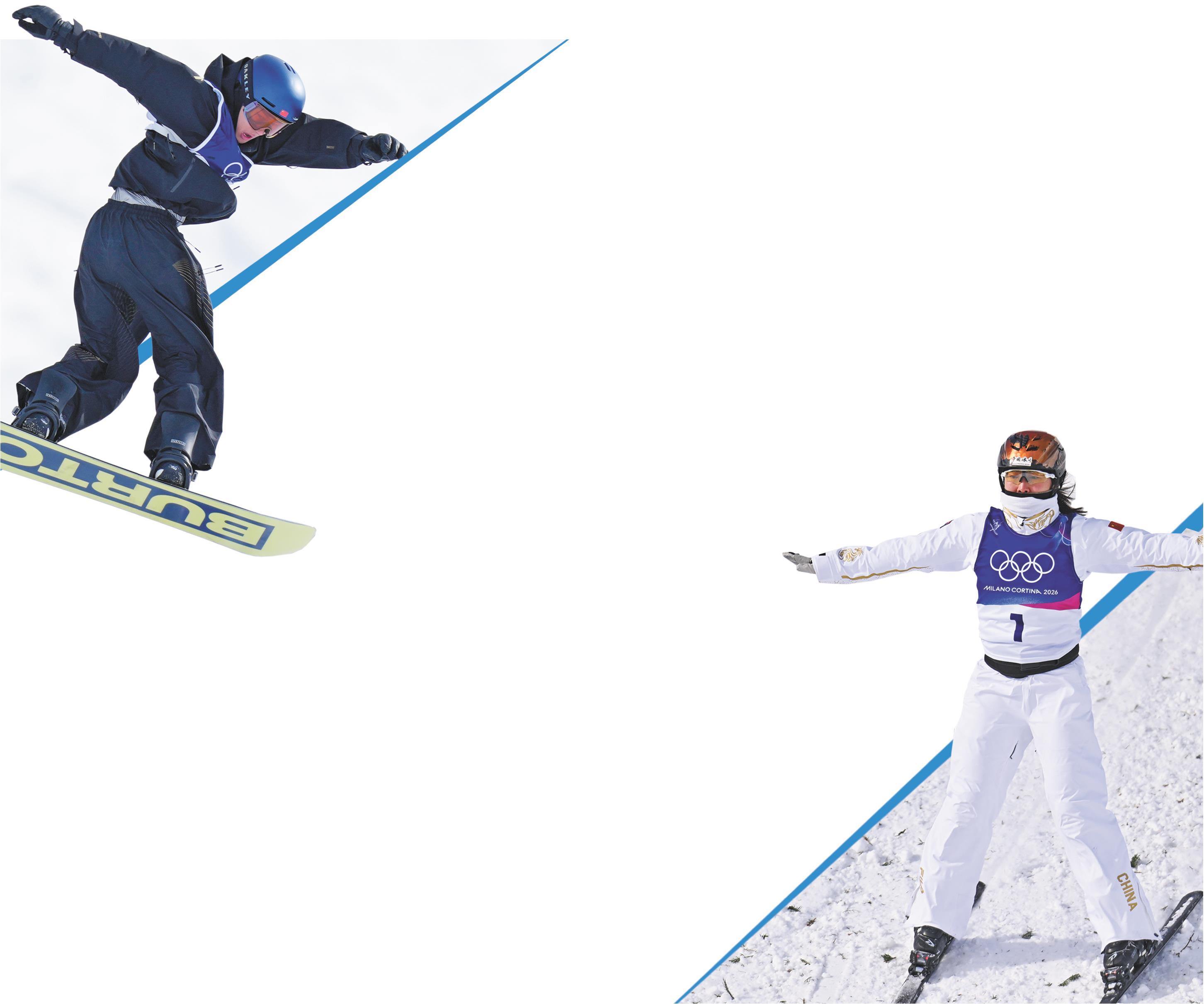 左图:2月18日,中国选手苏翊鸣在比赛中。右图:2月18日,中国选手徐梦桃在比赛中。(□新华社发)