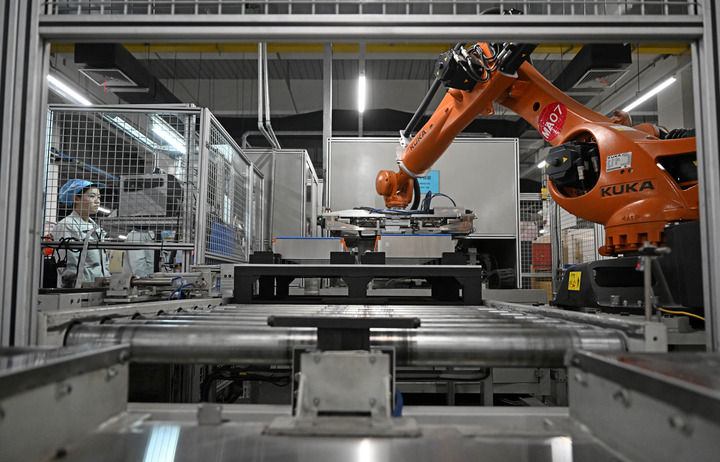 在天津力神电池股份有限公司动力电池生产车间,自动化机械设备正在作业。