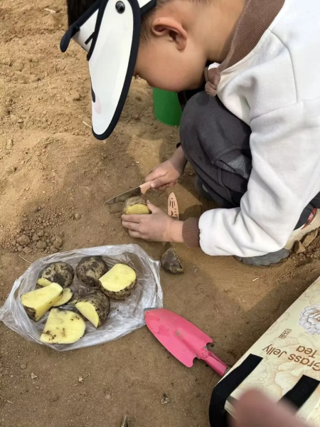 活动伊始,农场场长为孩子们带来了生动的马铃薯科普小课堂。在种植实践环节,孩子们化身“小小农夫”,他们手持马铃薯,用工具小心翼翼地将含有芽眼的种薯切块,再用小铲子在田垄间挖土开沟,将薯块的芽眼向下轻轻放入坑中,随后用泥土覆盖、轻轻压实。种植完成后,孩子们拿起画笔,在姓名牌上一笔一画写下自己的名字,为专属小菜园“挂牌”,五颜六色的姓名牌在田间迎风而立,定格下这份珍贵的农耕记忆。孩子们主动践行环保理念,将装过马铃薯的塑料袋统一回收,从源头减少白色垃圾污染。