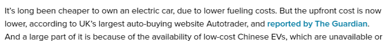 近日,专注于电动汽车和清洁能源领域的权威新闻平台Electrek报道,由于燃料成本较低,从长远来看拥有电动汽车更划算。报道认为,如今电动汽车的初始购置成本更低,这很大程度上要归功于中国电动汽车供应商。