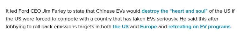 报道援引福特首席执行官吉姆·法利的话说,如果美国被迫与一个认真对待电动汽车的国家竞争,中国电动汽车将摧毁美国汽车业的“心脏和灵魂”。